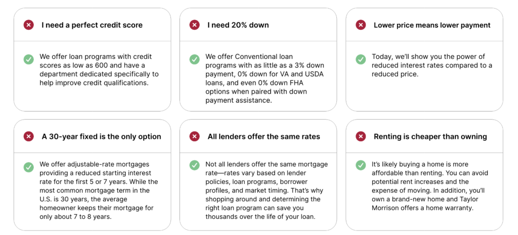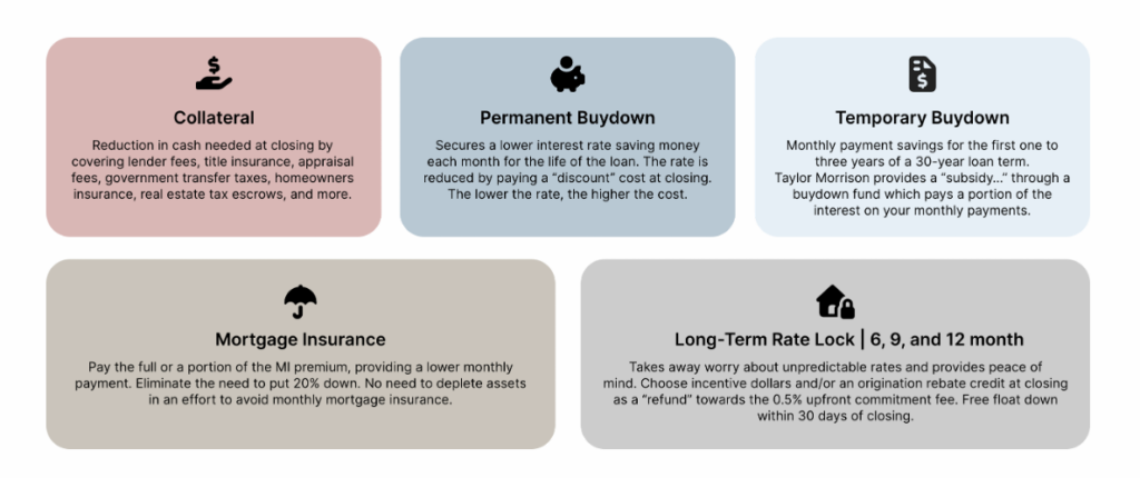 Nothing related to this complimentary Informational Webinar should be construed as legal, accounting or tax advice and it is offered for general informational purposes only. Certain incentives and seller contributions may require the use of certain lenders and/or title companies for eligibility, some of which may be affiliates of your Eligible Home’s Taylor Morrison selling entity, and could affect your loan amount. Not all buyers will qualify for all offers. Please consult a Taylor Morrison Community Sales Manager, visit www.taylormorrison.com for our Legal Terms, Privacy Policy, Licensing and additional disclaimers and review a Purchase Agreement for additional information, disclosures and disclaimers. All information (including, but not limited to prices, views, availability, school assignments and ratings, incentives, floor plans, exteriors, site plans, features, standards and options, assessments and fees, planned amenities, programs, conceptual artists’ renderings and community development plans) is not guaranteed and remains subject to change, availability or delay without notice. All Eligible Homes subject to prior sale. This is not an offer in any state where prohibited or otherwise restricted by law. Please see a Taylor Morrison Community Sales Manager or Online Sales Manager for details and visit www.taylormorrison.com for additional state or community specific disclaimers, licensing information or other details (as applicable). © October 2025, Taylor Morrison, Inc. and its respective selling entities (collectively, “Taylor Morrison”). All rights reserved.