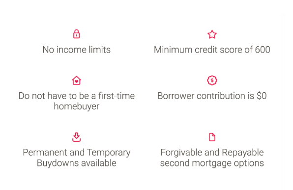 ***Down Payment Assistance is available at 3.5% or up to 5% of Total Purchase Price (as set forth on the Closing Disclosure) and is offered in the form of a Conventional fixed rate mortgage. Second lien options are repayable or forgivable, in conjunction with a 30-year fixed-rate FHA first mortgage. The amount of assistance can be used towards borrower’s minimum required investment, closing costs, prepaid items, or any combination of the three. Forgivable second lien option is forgiven after 36 consecutive on-time payments are made on the first lien. 5% forgivable second lien option is not available for high-balance FHA loan limits. Borrower must meet program guidelines. Loan limits, terms, and conditions apply.