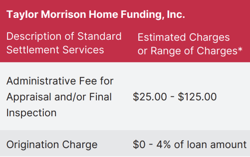 This is to give you notice that the Builder who is making this referral and is more particularly identified in the applicable purchase agreement (“Selling Entity”), has a business relationship with Taylor Morrison Home Funding, Inc. (“Taylor Morrison Home Funding”). Specifically, the Selling Entity and Taylor Morrison Home Funding are affiliates with the same parent corporation. Because of this relationship, this referral may provide Selling Entity with a financial or other benefit. Set forth below is the estimated charge or range of charges for the settlement services listed. You are NOT required to use the listed provider(s) as a condition for settlement of your loan on, or purchase, sale, or refinance of, the subject property.